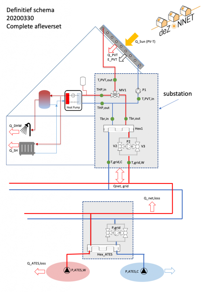 The heating grid temperatures, with one hot and one cold pipe, are set in such a way that most of the heat generated on the roofs can be harvested. It does mean that the storage temperature may not be too high. That said, if the heating grid temperature is high, the heat pump’s yield will be higher (the COP, coefficient of performance, is the ratio between the generated heat and the electricity consumed).
