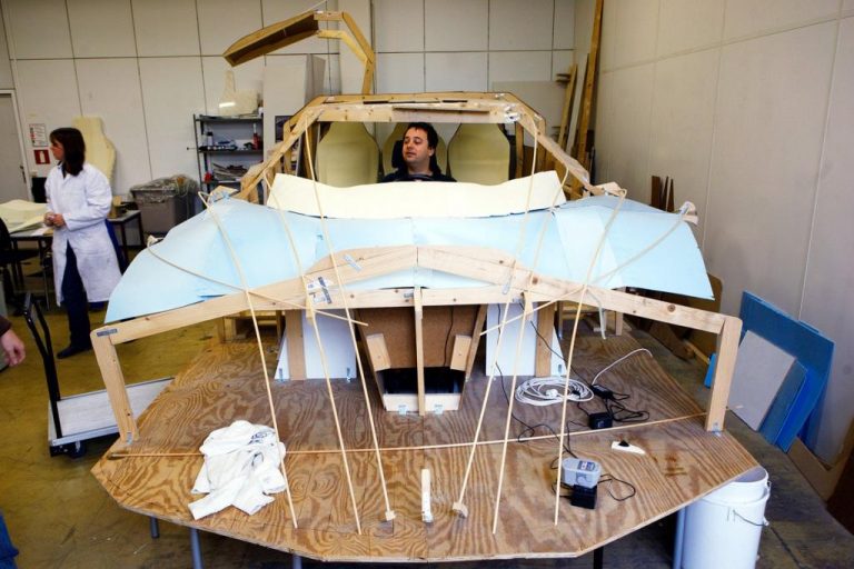 Students test the driver’s view in a mock-up of the Superbus. December 2017. (Photo: Sam Rentmeester)