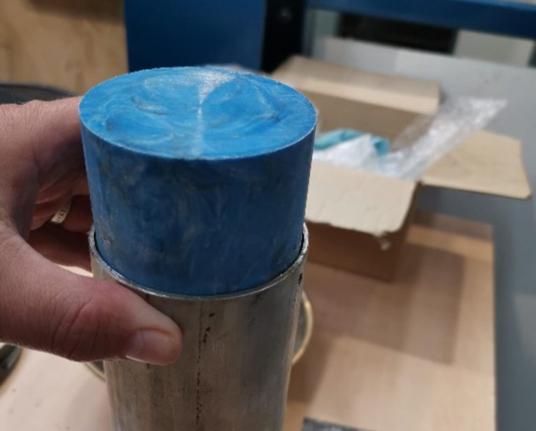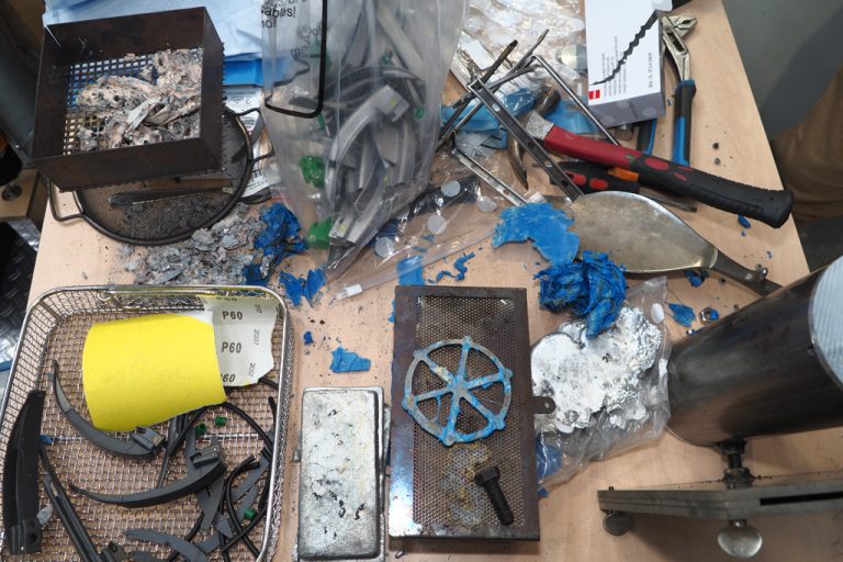 Vervolgens verlegden ze hun focus naar plastic afval – de blauwe zakken, lakens, en inpak ‘papier’ dat op operatiekamers en sterilisatieafdelingen in gebruik is. Niet vies van experimenten bouwden ze een smeltoven in een Delfts laboratorium. Het blauwe polypropyleen kan hier gesmolten en gelijk geperst worden in de vorm van platen, staven of strips waar nieuwe producten van kunnen worden gemaakt. Circulair, nietwaar.