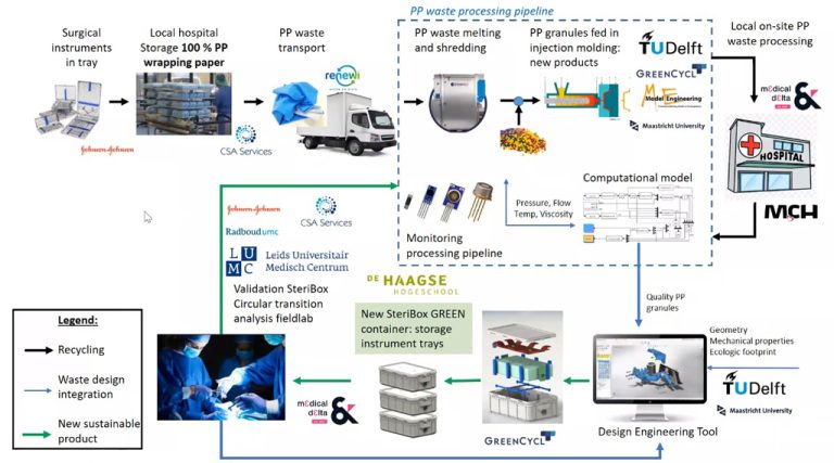 “Het is praktisch, maar het is tegelijk wetenschappelijk onderzoek”, zegt Horeman. Plastic-experts vertelden dat volledig gerecycled polypropyleen niet geschikt is voor hergebruik. Maar ondertussen gebruiken ze het materiaal voor handvaten en kratjes voor chirurgische instrumenten. “We hebben het ontwerp en de functies van de producten aangepast aan de eigenschappen van het gerecyclede materiaal”, legt Horeman uit. “Op die manier snijdt het mes aan vele kanten tegelijk.”
