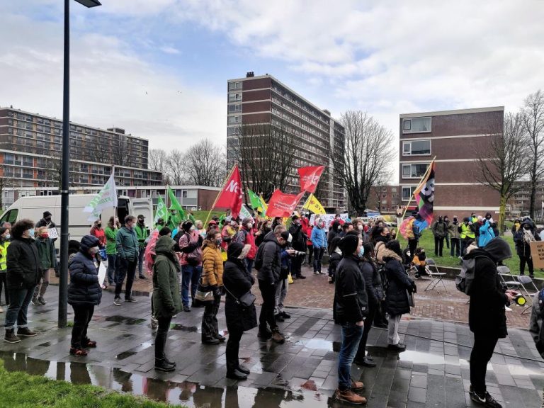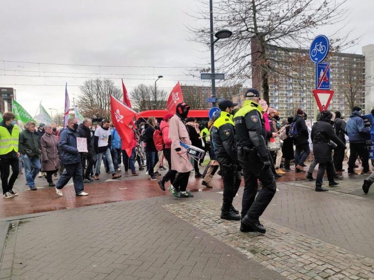 Daar blijft het niet bij. Want terwijl de vlaggen van politieke partijen Bij1, GroenLinks en Stip hoorbaar wapperen, presenteert hij eisen specifiek voor de gemeente Delft. Jansen kijkt een aantal van de aanwezige politici aan. “Gemeenteraad, luisteren jullie mee?