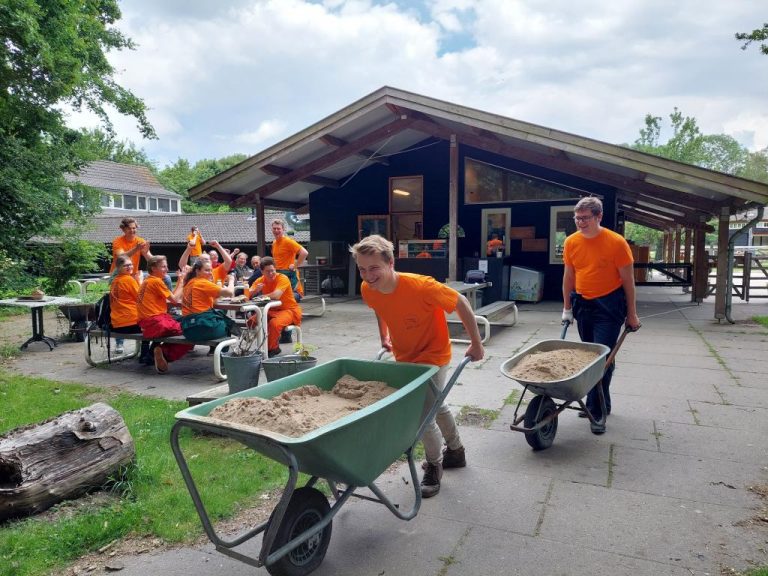 Bij stadsboerderij BuytenDelft in de Delftse Hout hebben leden van studievereniging Leeghwater (werktuigbouwkunde) inmiddels pauze. Voorzitter Mees werkt er samen met bestuursgenoten, opvolgers en andere leden aan de bouw van een takkenmuur en het verplaatsen van zand van de ene naar de andere kant van het terrein. “Het is zo leuk om met zijn allen bezig te zijn en te zien dat je vooruitgang boekt”, vertelt hij.