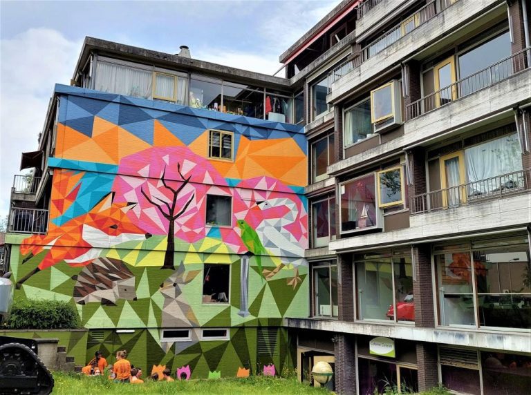 Aan de andere kant van Delft, in de wijk Buitenhof, is het een kleurrijke bedoening. Studievereniging Stylos (Bouwkunde) werkt er samen met medewerkers van SHS Delft en cultureel podium Cultuurlab aan een muurschildering bij Abtswoude Bloeit, het voormalige verzorgingstehuis waar nu studenten, ouderen en Oekraïense vluchtelingen samenwonen. Het ontwerp voor de schildering is gemaakt door Stylos-lid en bewoner Stijn en door de inwoners gekozen.