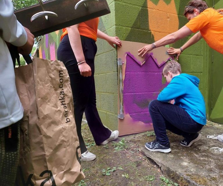 Tijdens StudentDoet! leggen inwoners, vrijwilligers en Oekraïense kinderen samen met kunstenaar Micha de Bie de laatste hand aan de muurschildering.