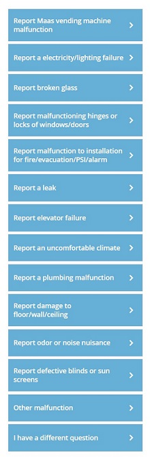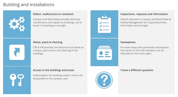 Until recently, even for the most trivial questions, you had to submit a ‘call’ in the Self Service Portal. My call would have been ‘It is cold in my room because the heating does not work’. That would have taken me 30 seconds. That time has passed. I am now required to work my way through a maze of questions to find the right department for my call. In this case, the process went as follows.
