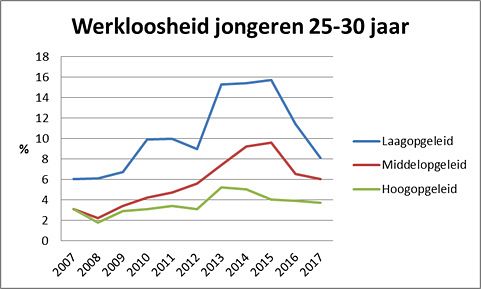 Dat strookt ook met de jongste cijfers over hoogopgeleide jongeren tussen de 25 en 30 jaar, waarin de werkloosheid eveneens licht daalt. In het eerste kwartaal van 2017 was nog 3,7 procent van hen werkloos. Ter vergelijking: in 2008, het jaar van de economische crisis, was dit slechts 1,8 procent: het laagste in tien jaar tijd.