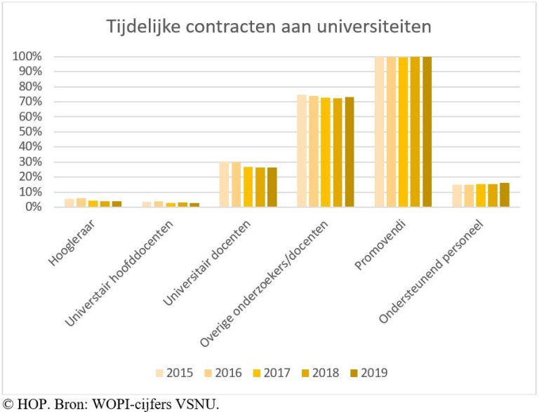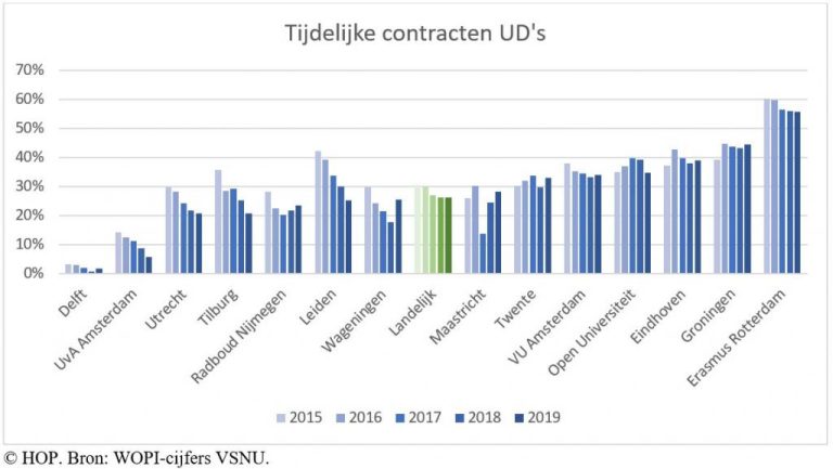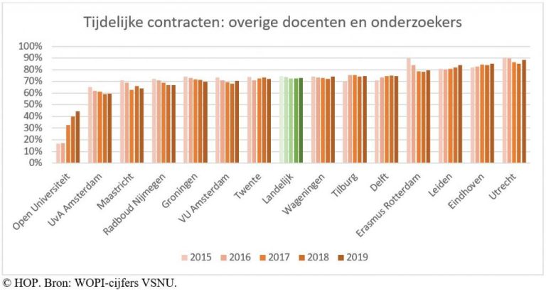 Zulke verschillen zijn er ook voor de postdocs en overige docenten. Aan de Universiteit van Amsterdam had in 2019 ‘slechts’ 59 procent van deze groep een tijdelijk contract, aan de TU Delft 75 procent en aan de Universiteit Utrecht 90 procent.