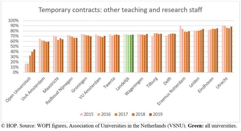 Similar differences can also be seen for postdocs and other teaching staff. At the University of Amsterdam, 59 percent of this group have a temporary contract: while this may seem high, at TU Delft that figure is 75 per cent and at Utrecht University even 90 percent.