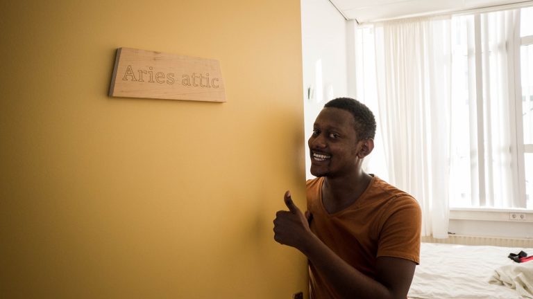 Student psychologie Raphaello – Ricardo – Hoekstra (24): “Nu ik in dit huis woon, snap ik pas écht hoe moeilijk het is om uit een vreemd land te vluchten.” De studenten helpen de statushouders met zaken als een fiets kopen via Marktplaats en het leren van de Nederlandse taal. “En als de jongens een brief krijgen van de gemeente, vertalen wij die,” zegt Pieter. Ook op culinair gebied wisselen de huisgenoten tips uit. “Adam heeft mij geleerd hoe je een ‘ovenschotel’ maakt,” vertelt Ali terwijl Pieter lachend met zijn hoofd schudt. “Met aardappelpuree uit een pakje. Dat smaakt heerlijk!”