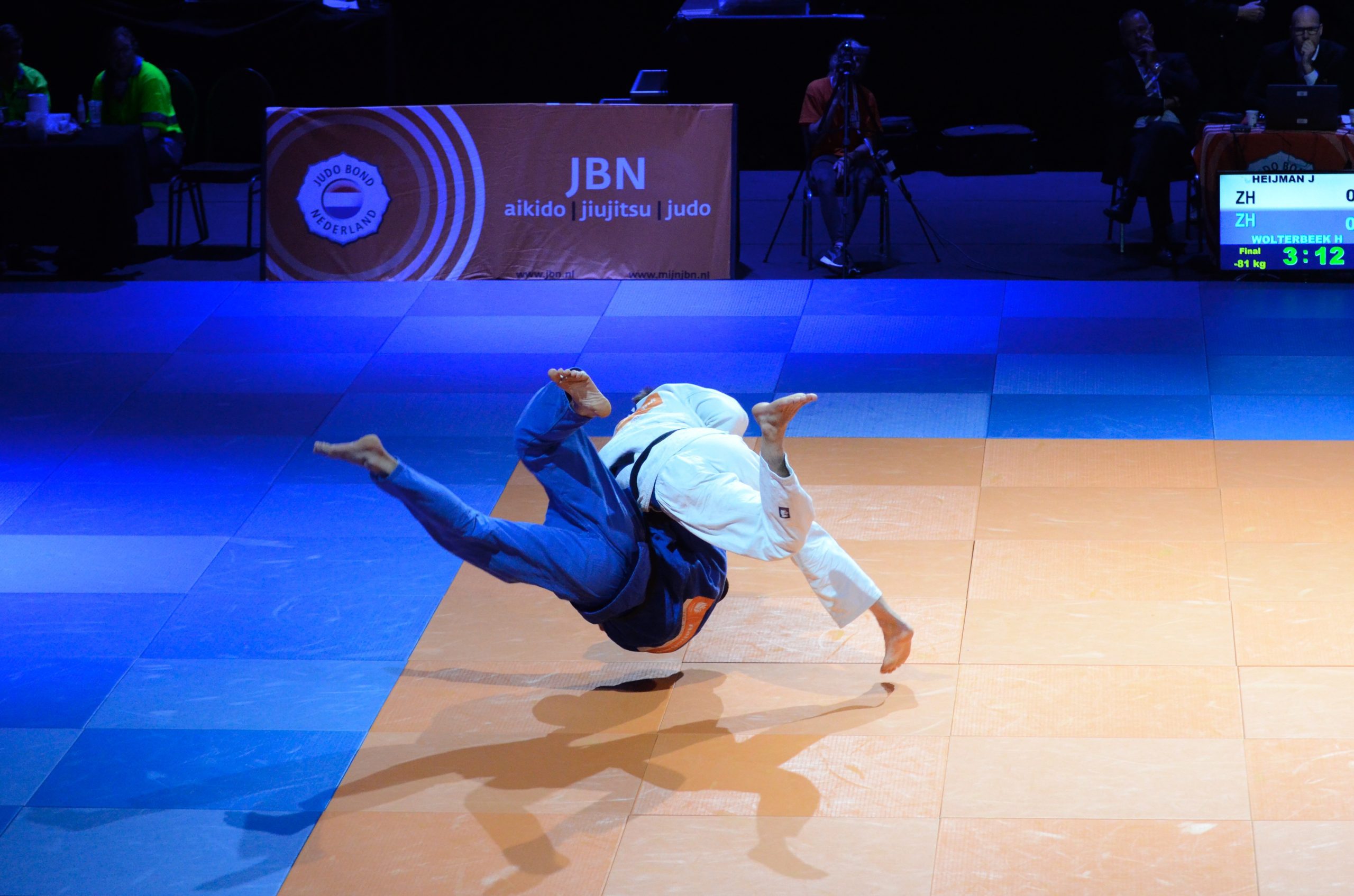 Jim Heijman (wit) werpt in de finale zijn opponent Hidde Wolterbeek tegen de grond.