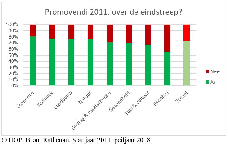 Het Rathenau Instituut heeft de landelijke cijfers op een rijtje gezet in een factsheet. De verschillen tussen de vakgebieden blijken groot. Van de promoverende juristen maakt zo’n 40 procent het proefschrift uiteindelijk niet af. Het ene jaar zijn er meer afhakers, het andere jaar minder, maar het zijn er onder juristen twee keer zo veel als in de economie, landbouw, techniek en natuurwetenschappen. Daar stopt zo’n 20 procent voortijdig.