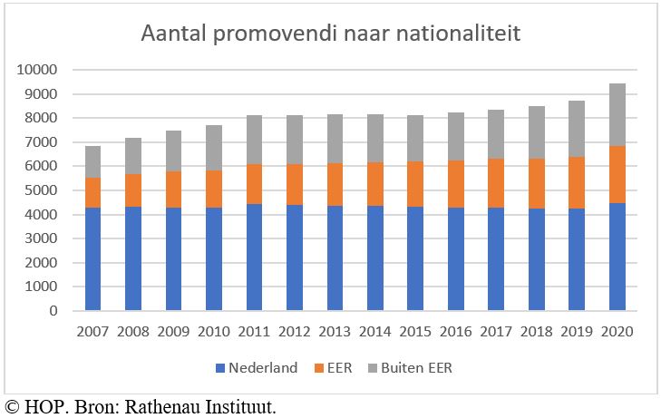 Landelijk blijft het aantal Nederlandse promovendi in dienst van de universiteiten door de jaren heen ongeveer gelijk, terwijl er steeds meer buitenlandse promovendi komen. De meeste van deze internationale promovendi komen van buiten Europa.