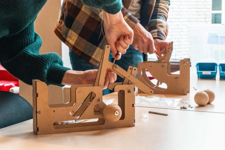 Na het demonstreren was het tijd om te demonteren. Daarbij is goed gekeken naar onderdelen die hergebruikt kunnen worden als bouten, moeren, stelringen en imbussleuteltjes. Niet alle knikkermachines zijn uit elkaar gehaald, sommige studenten wilden hun bouwwerken mee naar huis nemen. (BK)