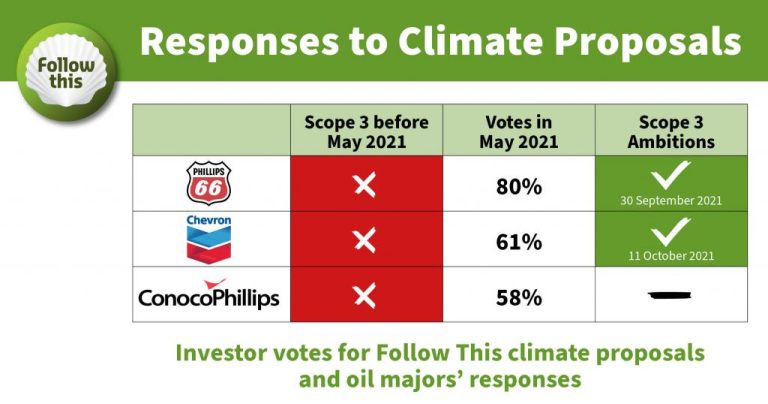 Over de ambitie van Chevron is hij minder lovend: “Een reductie van gemiddeld 5 procent in 2028 is verreweg onvoldoende om Parijs te halen. Om Parijs te halen is een absolute reductie van 40 procent in 2030 nodig, wat nog geen enkel olie- en gasbedrijf van plan is. Conclusie: Klimaatresoluties werken en blijven nodig. We blijven daarom klimaatresoluties indienen tot deze bedrijven volledig in lijn met Parijs zijn.” Wordt vervolgd.