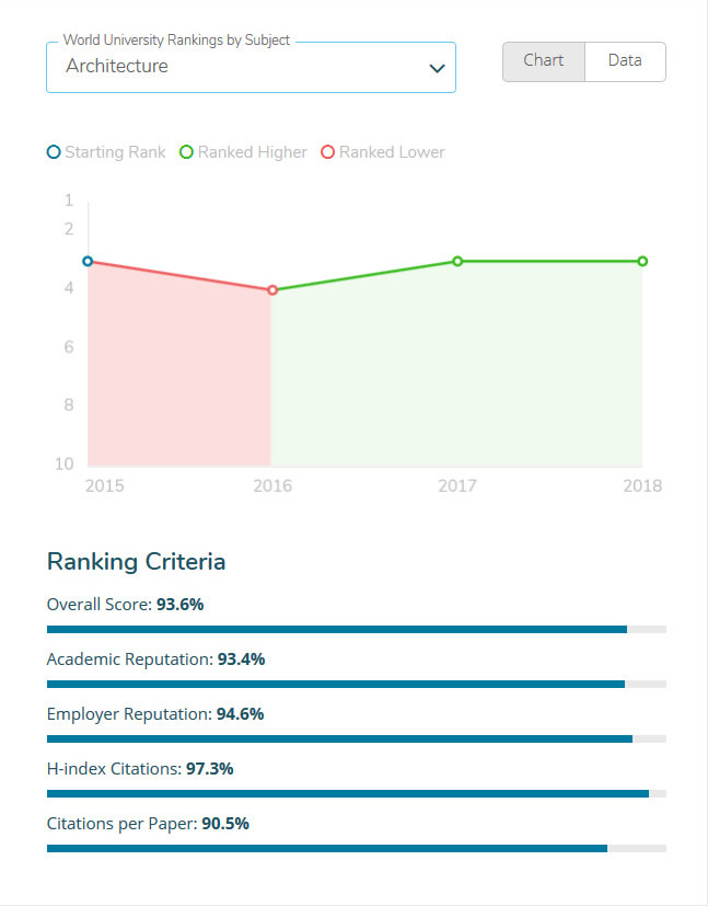 De top 3 in de categorie Architectuur ziet er dit jaar hetzelfde uit als in 2017, met het Massachusetts Institute of Technology bovenaan, gevolgd door University College Londen en op drie de TU Delft. De goede prestatie van de TU Delft is vooral toe te schrijven aan de H-index. Daarvoor krijgt de universiteit een score van 97 procent.