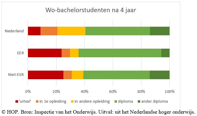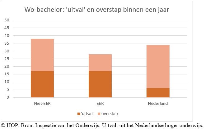 Binnen een jaar blijkt 17 procent van de internationale studenten weer vertrokken. Daarin is geen verschil tussen studenten van binnen en buiten de Europese Economische Ruimte (EER). Misschien kiezen ze een opleiding in een ander land, maar daar zijn geen cijfers over. De inspectie noemt het ‘uitval’.