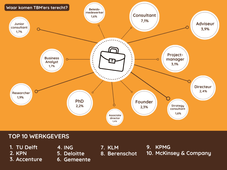 In de database komen 412 verschillende beroepen voor, van adviseur tot zeil- en windsurfinstructeur. De meest voorkomende banen voor TBM-alumni zijn consultant, adviseur en projectmanager. Maar de spreiding is zo enorm dat ook het percentage alumni die deze meest voorkomende banen hebben, laag blijft.