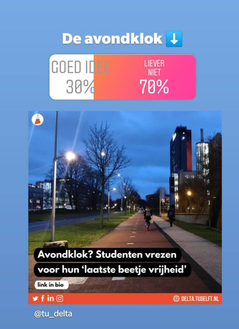 instagram.com/tu_deltaIn een poll van Delta op Instagram zegt een groot deel van de deelnemers de avondklok een slecht idee te vinden: 229 studenten waren voor, terwijl 527 zo’n maatregel er liever niet zien komen.