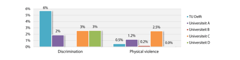 The most striking figures in the 2020 Monitor are the figures on discrimination. The rates are higher at TU Delft than at four other anonymous universities that undertook the same research (in Dutch) in the Netherlands.