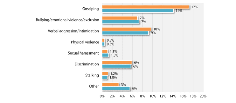 While socially undesirable behaviour has reduced in totality since 2017, the improvement depends on the subject. So while the Employee Monitor shows fewer reported incidence of gossip, the percentages for bullying, verbal aggression and discrimination remain more or less unchanged.