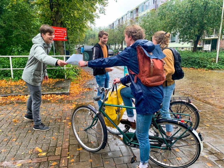Wat mag er tijdens corona wel en niet in studentenhuizen? Studenten delen posters met spelregels uit in oktober 2020. (Foto: Dalia Madi)