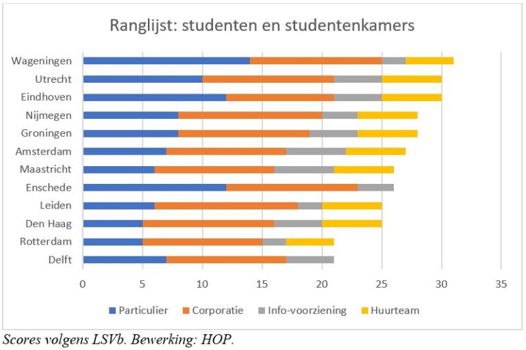 De studentenvakbond heeft een ranglijst gemaakt, al weerspiegelt die niet een-op-een de woningnood en de huurprijzen. De steden krijgen ook punten voor overleg, beleid en informatievoorziening. Het dure Amsterdam staat daarom in de middenmoot en Utrecht is gedeeld tweede. In Enschede zijn de kamers het goedkoopst, maar de stad heeft geen ‘huurteam’, waar je advies kunt inwinnen als je bijvoorbeeld te veel huur betaalt of met een malafide huisjesmelker te maken hebt.