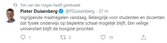 Totdat die plicht wettelijk is vastgelegd, geldt alvast een ‘dringend advies’. Minister Van Engelshoven had dat maandag al aangekondigd, al hield ze formeel nog een slag om de arm. Ze dacht dat universiteiten en hogescholen inmiddels zelf al hun huisregels zouden hebben aangepast. Dat blijkt niet het geval. De voorzitter van universiteitenvereniging VSNU reageerde na de persconferentie meteen met onderstaande tweet, die werd geretweet door de Delftse rector magnificus Tim van der Hagen:
