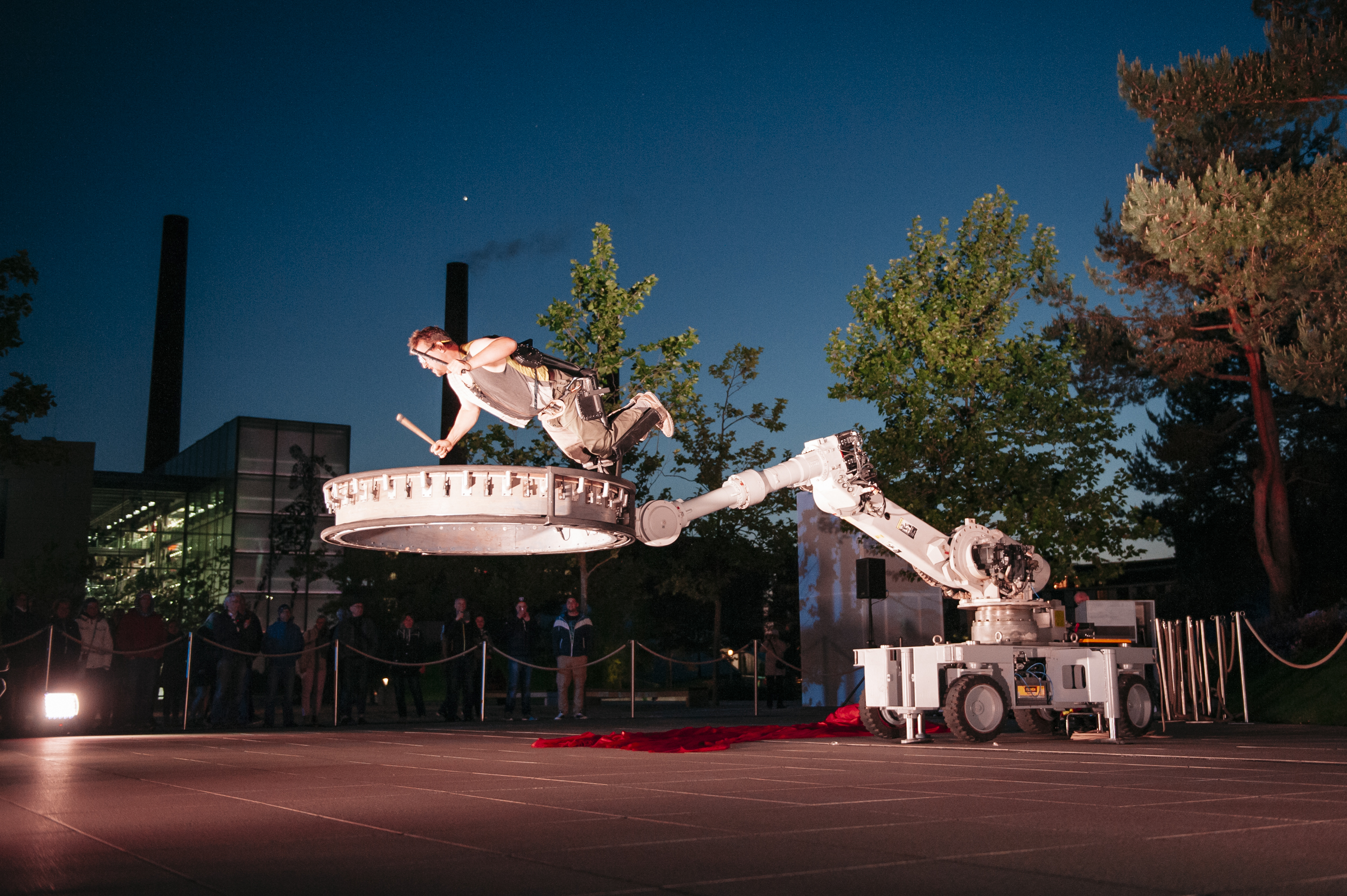 Bij de voorstelling DrumGod, deels gesponsord door de TU Delft, wordt een drummer meegenomen door een robotarm. Foto: Mooi Weer Spelen