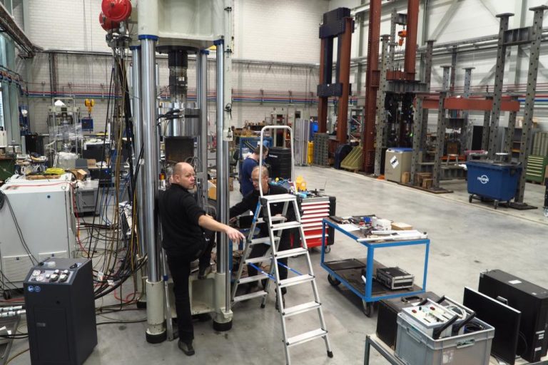 There are numerous hydraulic presses in the testing hall of the Building Innovation Lab. (Photo: Jos Wassink)