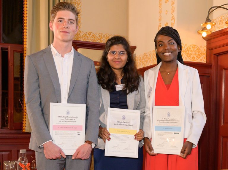 Drie Delftse afstudeerders vallen in de prijzen: Riddhi Kapoor (Nederlandse Gasindustrieprijs ter waarde van 6000 euro), Maite Gieskes (KHMW Jong talentprijs, 3000 euro) en Dirk van Bokkem (KHMW Jong talentprijs, 1000 euro)