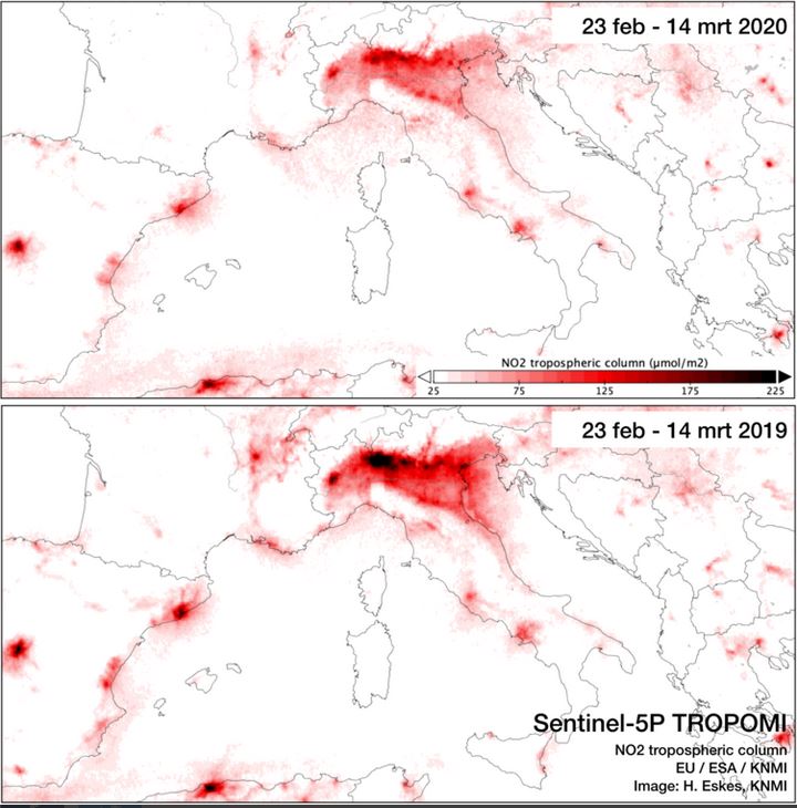 De concentraties NO2 in Italië in de periode 23 februari tot en met 14 maart in 2019 (onder) vergeleken met dezelfde periode in 2020 (boven). (Bron: EU/ESA/KNMI )