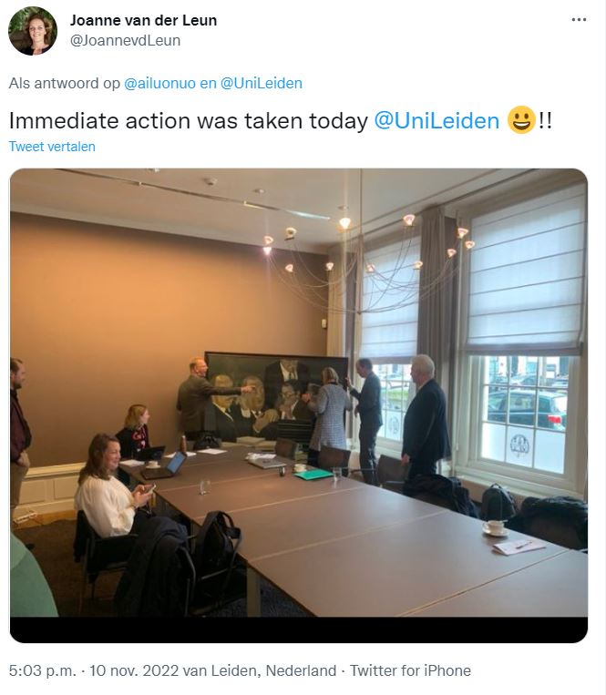 De decaan van de faculteit Rechtsgeleerdheid, Joanne van der Leun, antwoordde dat er veel discussie over het schilderij was. Wat haar betreft kon het van de muur. Twee dagen later twitterde ze een foto van de verwijdering.
