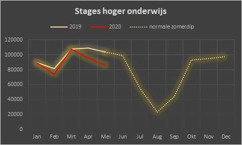 Uit de cijfers van statistiekbureau CBS, tot mei 2020, blijkt inderdaad dat er minder studenten op stage zijn. Vanaf maart, als de eerste lockdown ingaat, daalt het aantal stages abrupt. In mei 2019 waren er 104 duizend studenten op stage, in mei 2020 waren dat er maar 85,6 duizend.