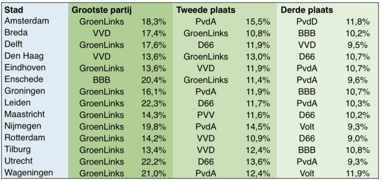 GroenLinks scoorde goed: de partij werd de grootste in Amsterdam, Delft, Eindhoven, Groningen, Leiden, Maastricht, Nijmegen, Rotterdam, Tilburg, Utrecht en Wageningen. In Den Haag en Breda is de VVD de nummer één geworden, maar staat GroenLinks op de tweede plek.  (HOP, PvT)