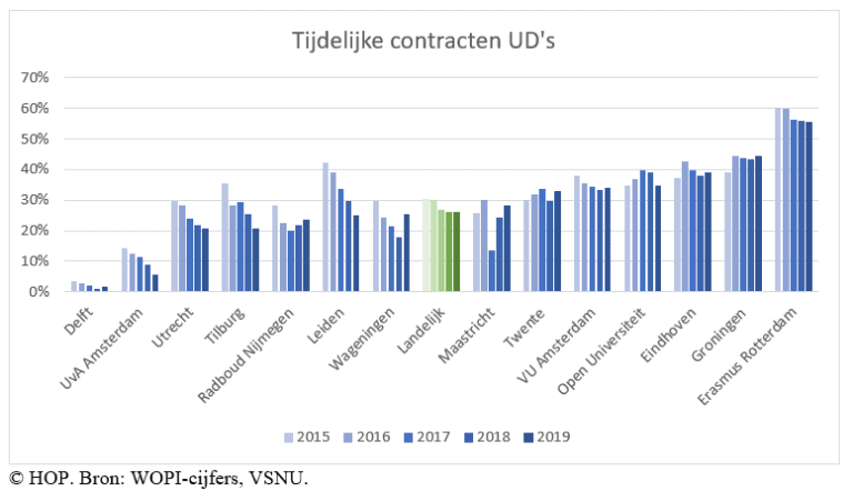 Een kwart van alle universitair docenten (ud’s) zit tijdelijk op zijn of haar post. Hetzelfde geldt voor driekwart van de ‘overige’ docenten en onderzoekers. Promovendi hebben sowieso allemaal een tijdelijk contract.
