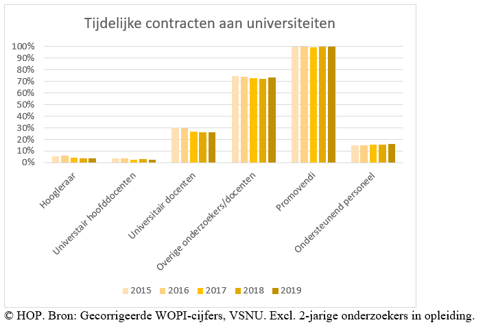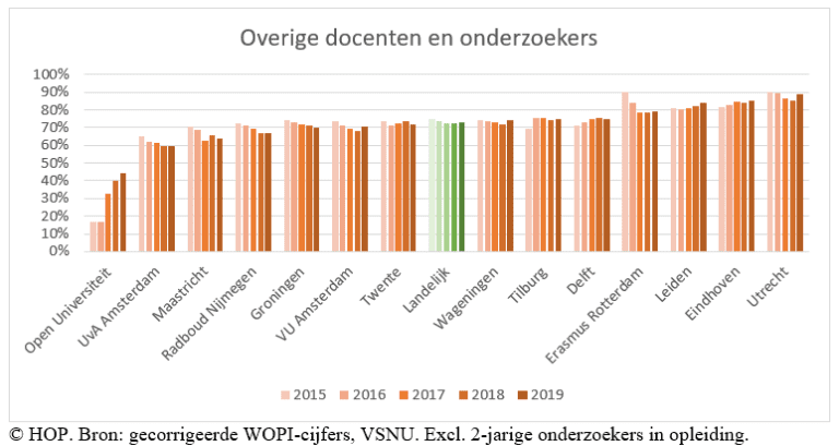 Alles bij elkaar heeft 59 procent van al het personeel aan de universiteiten een tijdelijke aanstelling. Zonder de promovendi en ondersteunende diensten gaat het om 39 procent. Daar komt niet of nauwelijks verandering in.