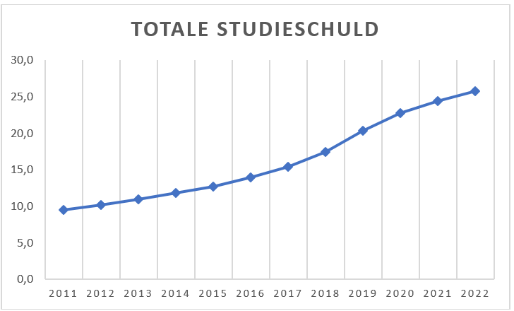 In zeven jaar tijd is de totale studieschuld in Nederland verdubbeld naar 25,7 miljard euro. Onder jongeren zijn studieschulden van 20 duizend euro inmiddels normaal, blijkt uit nieuwe cijfers van het Centraal Bureau voor de Statistiek. Per september 2015 is de basisbeurs afgeschaft voor nieuwe studenten in het hoger onderwijs. De totale studieschuld was toen 12,7 miljard euro.