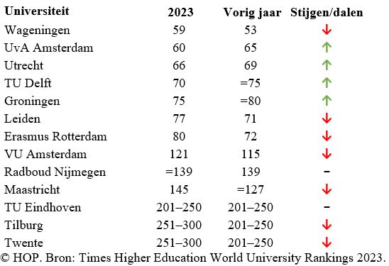 Volgens de Britse ranking behoren nog altijd tien Nederlandse universiteiten tot de beste tweehonderd van de wereld. Slechts vijf landen hebben er meer: de Verenigde Staten, Groot-Brittannië, Duitsland, Australië en – voor het eerst – China.