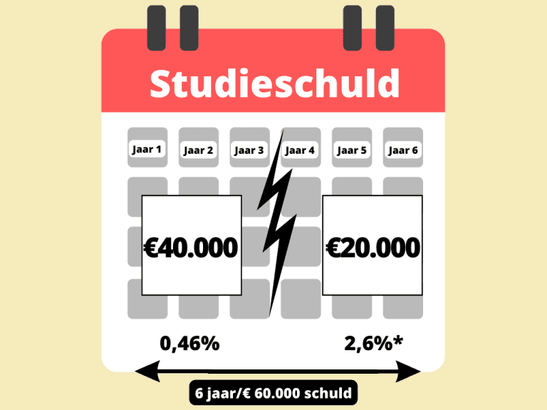 Tot zover vrij simpel, toch? Let op, want hier wordt het iets lastiger. Welke rente je de eerste vijf jaar betaalt, wordt vastgesteld in het jaar nádat je je studiefinanciering stopzet (bijvoorbeeld wanneer je afstudeert en stopt met lenen). Dat gebeurt om preciezer te zijn in de zogenoemde ‘aanloopfase’, dat is de periode van twee jaar na afstuderen waarin je nog niet hoeft af te lossen. Ho-studenten die in 2022 hun studie afronden, vallen daardoor niet onder het tarief van 2022 (0 procent), maar onder het rentepercentage dat op 1 januari 2023 ingaat (0,46 procent). Wie in 2023 afstudeert, krijgt het rentepercentage van 1 januari 2024 toebedeeld. Wie in 2024 afstudeert met het rentepercentage van 2025, enzovoorts.