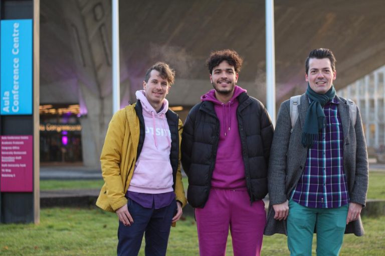 De ondertekenaars van de open brief over de progress-vlag (vlnr): Laurens Weijs van Outsite, Abdelkader Karbache van de centrale studentenraad (Lijst Bèta) en Julien van Campen van True U. (Foto: Justyna Botor)