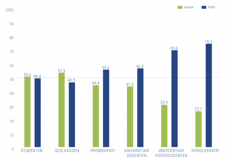 Aan het eind van monitorjaar 2020 waren 3.555 hoogleraren werkzaam aan Nederlandse universiteiten: 2.666 mannen en 889 vrouwen. Bij de studenten is het aandeel vrouwen (50,6%) net iets groter dan het aandeel mannen. Bij de geslaagden is het aandeel vrouwen zelfs nog iets groter (53,5%). Des te opvallender is dat verderop het academische loopbaanpad het aandeel vrouwen sterk terugvalt – zie de tabel. Ook bij de TU ‘lekt de pijplijn’, leert het dashboard genderdiversiteit.