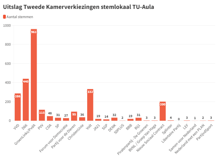 De uitslag van stembureau Aula is een goede weerspiegeling van Delta’s peiling naar het stemgedrag van de TU-gemeenschap. Ruim een derde (37 procent) van de studenten en medewerkers was van plan te stemmen op GroenLinks/PvdA, 3 procent op de PVV. Deze percentages zijn vrijwel gelijk aan de definitieve uitslag van het stembureau. (MvdV)