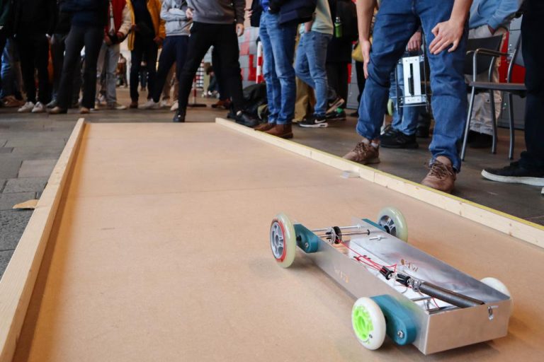 Een kleine 800 studenten, verdeeld over 127 groepen, verschenen maandag aan de startlijn van de twee wedstrijdbanen in de faculteit Werktuigbouw, Maritieme Techniek en Technische Materiaalkunde (3mE). In hun handen het ontwerp waaraan ze de afgelopen acht weken hadden gewerkt: een karretje dat zichzelf aandrijft, afremt en achteruit terugrijdt. Het wagentje dat de langste afstand aflegt en terugkeert tot aan de startstreep, wint.
