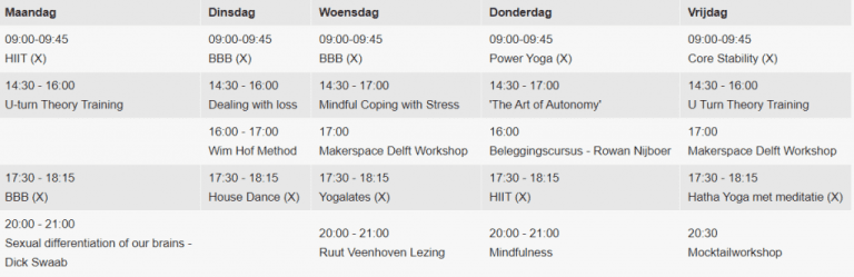 Studenten kunnen online trainingen, sportlessen, lezingen en workshops volgen. Denk aan trainingen gericht op het omgaan met stress, maar ook aan lichtere activiteiten zoals een Mocktailworkshop.