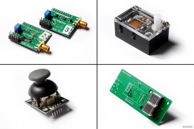 Prototype energy harvesters for radio waves (top left), pushing a button (top right) and two more push-buttons (bottom, right). The device bottom-left is a joystock (Photo’s: Sam Rentmeester)