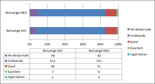 De meeste herstelperiodes gingen naar de universiteiten, maar er zijn in die periode ook meer universitaire opleidingen gekeurd. Verhoudingsgewijs zakten iets meer hbo-opleidingen door het ijs: 9,2 procent van de geaccrediteerde bekostigde hbo-opleidingen kreeg een herstelperiode, tegen 7,2 procent van de bekostigde wo-opleidingen