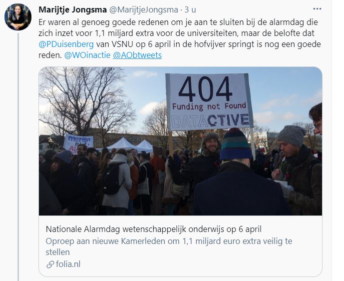 Onder diezelfde noemer organiseren de partijen daarom op 6 april een landelijke ‘alarmdag’. Ze willen dat het nieuwe kabinet structureel 1,1 miljard euro extra investeert in het wetenschappelijk onderwijs en onderzoek.