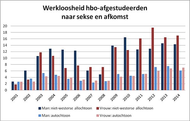 Sinds de economische crisis in 2009 heeft ongeveer vijftien procent van de allochtone hbo-gediplomeerden zelfs na anderhalf jaar geen werk. De werkloosheid is twee tot drie keer zo hoog als onder autochtonen.