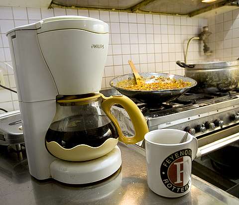 Elke avond vindt het uitlokkingsspel plaats, meestal aangezwengeld door degene die als maaltijdbereider vrijgesteld is van de koffiezetklus. “Het gebeurt al jaren en er trapt bijna altijd wel iemand in”, zegt bewoner Joppe Buntsma. Koffiedrinken is ook overdag een belangrijke bezigheid. Twee keer bellen via het bellenbord in de woonkamer staat voor: ‘wil je koffie?’. Dan zwaait menig kamerdeur open en klinkt de gevleugelde kreet: ‘ja lekker!’. “Het gebeurt bijna nooit, maar als er geen koffie in huis is, is de hele verdieping in rep en roer. We zijn echte gebruikers. Hij wordt gezet met een heel simpel Philips-apparaatje. We sparen ook zegels, van Douwe Egberts. Ik heb geen idee wie dat bijhoudt, maar ergens in een la moeten er duizenden liggen.”