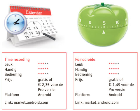 Helaas is niet zichtbaar aan welke taak je gewerkt hebt tijdens een interval. Om dit bij te houden kun je Time Recording gebruiken. Deze app werkt als een ouderwetse prikklok. Inchecken bij de start en uitchecken op het eind. Om goed overzicht te krijgen kunnen taken in categorieën gezet worden. Daarnaast krijg je met een druk op de knop een rapport over de dag, week of maand. Door doelen in te stellen controleer je eenvoudig of je nu eigenlijk wel zo veel doet als je denkt. De app ondersteunt het exporteren van de tijden naar het gangbare .csv formaat. Een functie die ook handig is voor freelancers. Een categorie per werkgever en aan het eind van de week kopieer je de uren zo in de facturen.